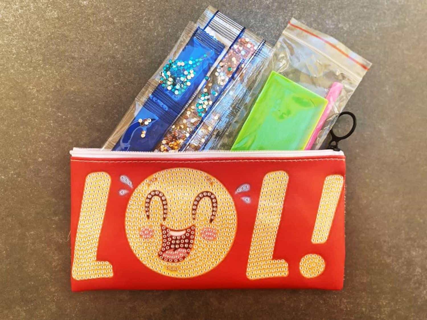 – 1 estuche con cierre con la imagen impresa y engomada – Todos los diamantes con los colores que necesitas